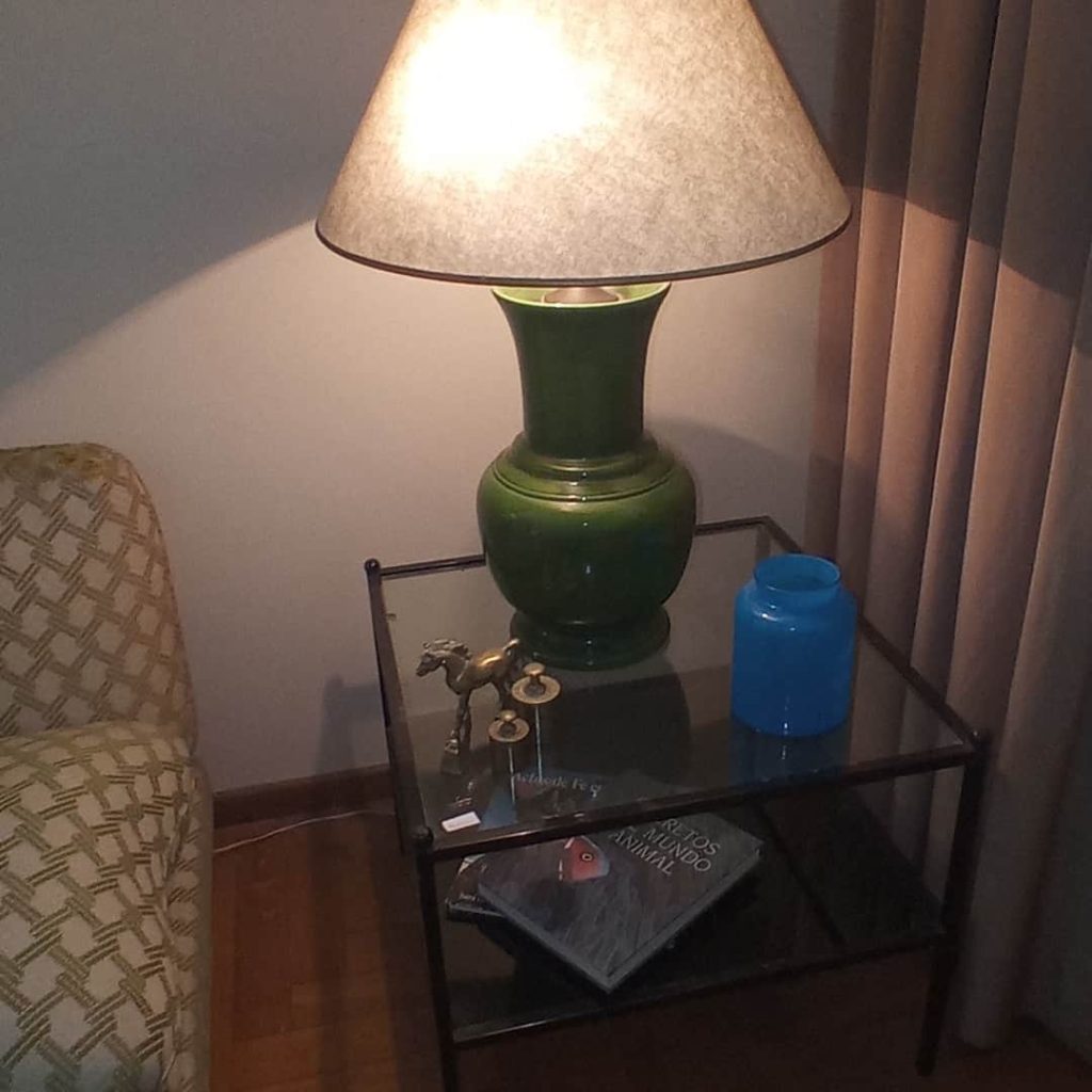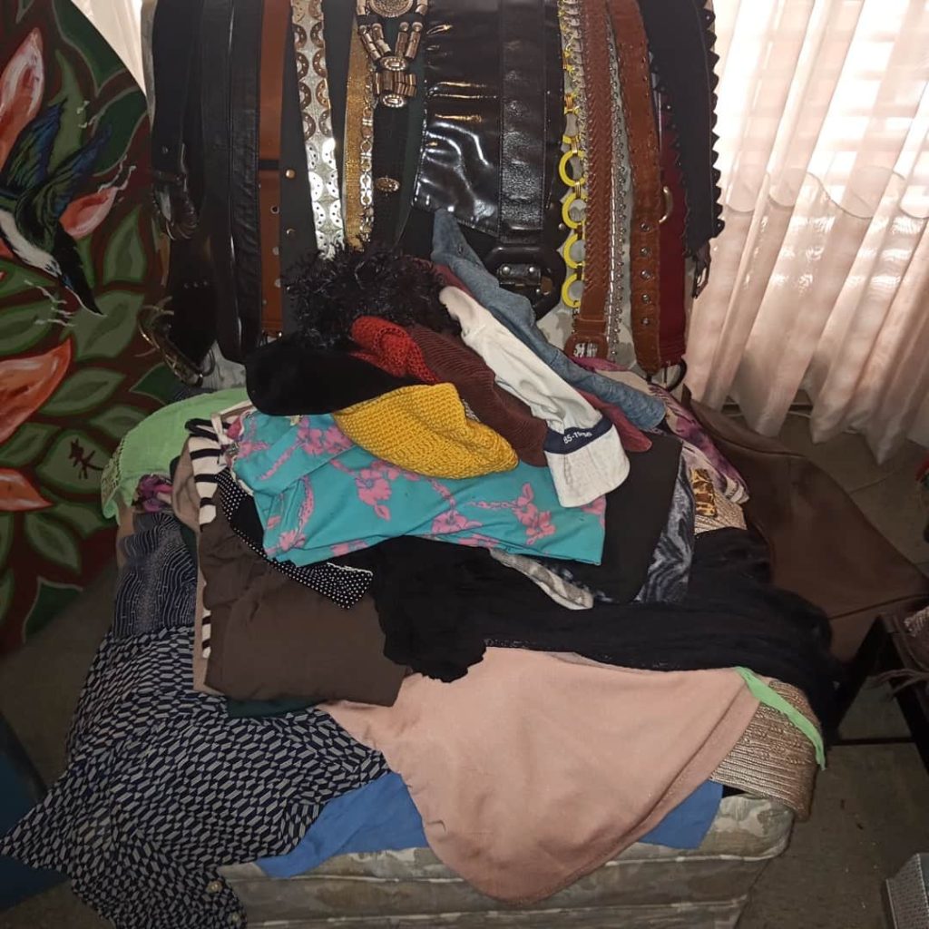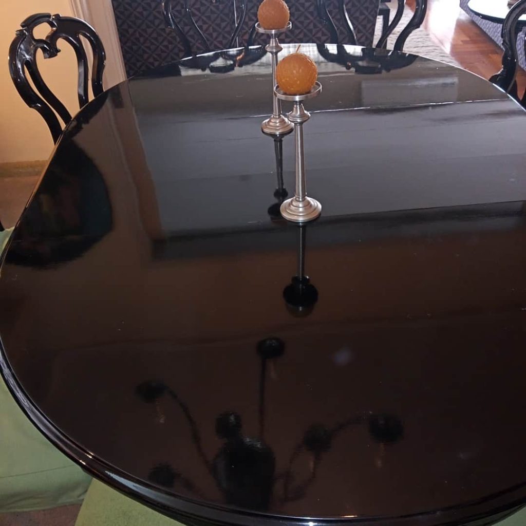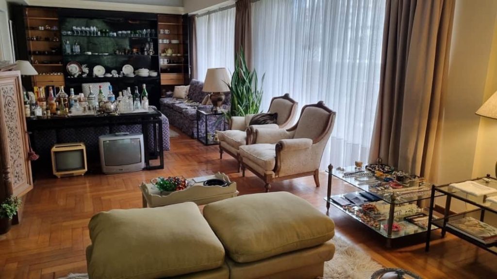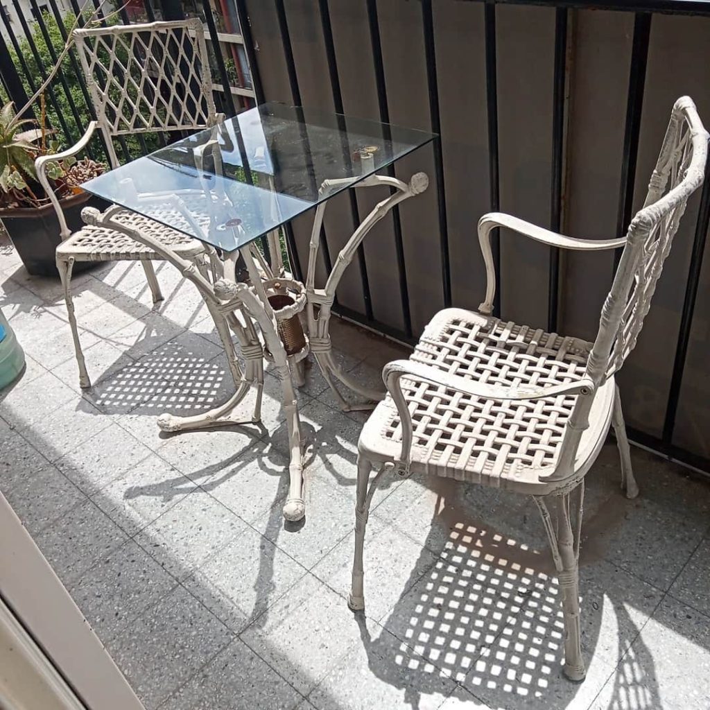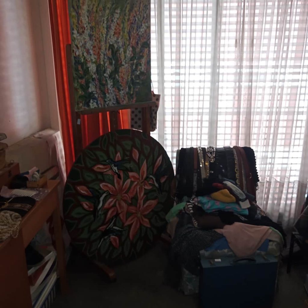 Sofá 4 cuerpos; sofá 1 cuerpo tapizado en pana; par butacones; par sillones 1 cuerpo estilo Francés; par sillas de sala con pata torneada; par butacones 2 cuerpos; butacón 3 cuerpos; 3 butacones 1 cuerpo; par banquetas puff; mesas auxiliares: 2 planos espejo y vítrea, diseño con estructura hierro y tapa vítrea, tapa redonda borde irregular, tapas redondas; consola diseño en hierro y vítrea; mueble auxiliar en madera lavada, tallada y patinada; comedor estilo Colonial Inglés laqueado en negro: mesa tapa oval y pie central con 10 sillas tapizado pana verde; vajillero laqueado en negro; cómoda estilo Inglés; cama con colchón; par mesas de luz estilo Inglés-Adornos y vajilla: juego de te en porcelana blanca Verbano; platos postre en porcelana europea; servicio de te en loza con guarda azul; servicio te en loza marrón; juego café en loza amarilla; tazas de te y café; servicio de mesa Microoven Brasilero con diseño botánico; servicio de mesa en porcelana Hartford con café y consomé; cristalería, juego copas talla flor y otras; par candeleros de vidrio prensado; copas talladas hialinas y verdes; botellones; hielera vintage; jarra con pico vertedor; caramelera de vidrio; lote de uvas vidrio; metal plateado, juego de cubiertos Plata Lappas Francés, con pescado; servicio de te y café; guisera y plato; lote cubiertos acero inoxidable; colección de cucharitas y cajitas; par gallos en bronce; reloj de mesa Alemán con números y agujas en bronce; “Perro” de bronce; óleos decorativos; espejo marco con espejitos, otros marco bronce, marco blanco, sol; araña estilo Holandés 2 niveles niquelada 12 luces; lámparas de mesa “Niño” en bronce, de cerámica degradé en violeta, de escritorio con pantalla de chapa, par de cerámica “Frutas”, par de cerámica verde oliva-Máquina de coser Singer; microondas Atma; pequeños electrodomésticos; enseres de cocina; jarra y copas en madera; bebidas; balcón: 2 silloncitos de hierro y mesa; atril antiguo y valija con elementos de pintura; libros; alfombras peludas; cortinas livianas y pesadas; almohadones, ropa de cama; manteles-Ropa mujer; accesorios, zapatos, carteras, bijoux y más…