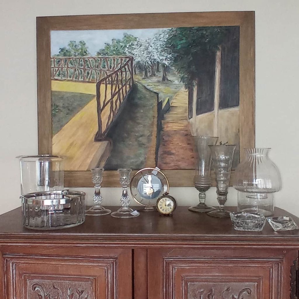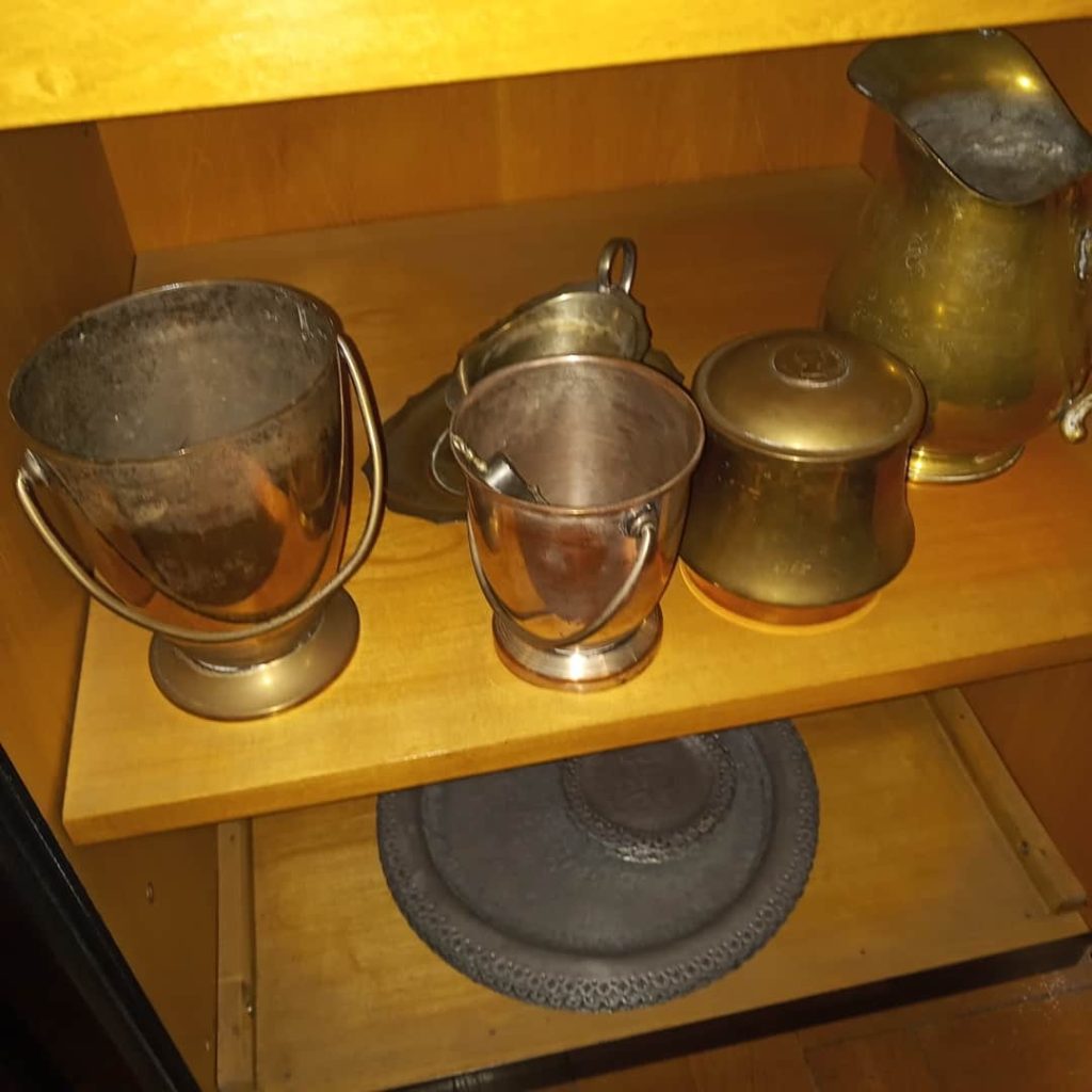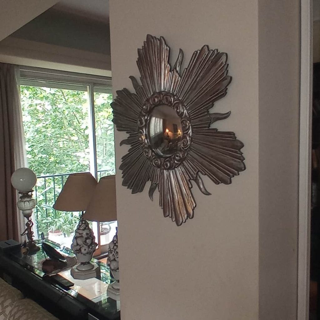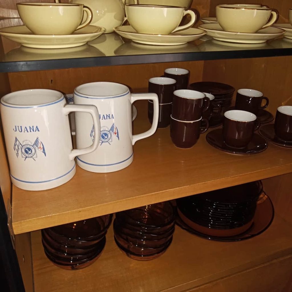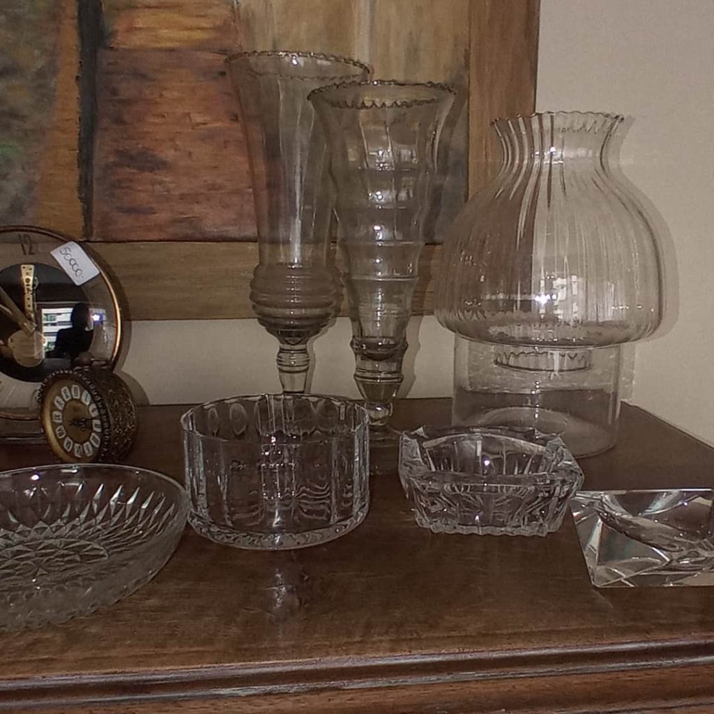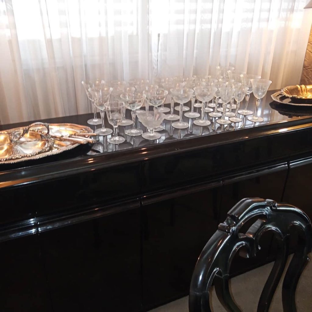 Sofá 4 cuerpos; sofá 1 cuerpo tapizado en pana; par butacones; par sillones 1 cuerpo estilo Francés; par sillas de sala con pata torneada; par butacones 2 cuerpos; butacón 3 cuerpos; 3 butacones 1 cuerpo; par banquetas puff; mesas auxiliares: 2 planos espejo y vítrea, diseño con estructura hierro y tapa vítrea, tapa redonda borde irregular, tapas redondas; consola diseño en hierro y vítrea; mueble auxiliar en madera lavada, tallada y patinada; comedor estilo Colonial Inglés laqueado en negro: mesa tapa oval y pie central con 10 sillas tapizado pana verde; vajillero laqueado en negro; cómoda estilo Inglés; cama con colchón; par mesas de luz estilo Inglés-Adornos y vajilla: juego de te en porcelana blanca Verbano; platos postre en porcelana europea; servicio de te en loza con guarda azul; servicio te en loza marrón; juego café en loza amarilla; tazas de te y café; servicio de mesa Microoven Brasilero con diseño botánico; servicio de mesa en porcelana Hartford con café y consomé; cristalería, juego copas talla flor y otras; par candeleros de vidrio prensado; copas talladas hialinas y verdes; botellones; hielera vintage; jarra con pico vertedor; caramelera de vidrio; lote de uvas vidrio; metal plateado, juego de cubiertos Plata Lappas Francés, con pescado; servicio de te y café; guisera y plato; lote cubiertos acero inoxidable; colección de cucharitas y cajitas; par gallos en bronce; reloj de mesa Alemán con números y agujas en bronce; “Perro” de bronce; óleos decorativos; espejo marco con espejitos, otros marco bronce, marco blanco, sol; araña estilo Holandés 2 niveles niquelada 12 luces; lámparas de mesa “Niño” en bronce, de cerámica degradé en violeta, de escritorio con pantalla de chapa, par de cerámica “Frutas”, par de cerámica verde oliva-Máquina de coser Singer; microondas Atma; pequeños electrodomésticos; enseres de cocina; jarra y copas en madera; bebidas; balcón: 2 silloncitos de hierro y mesa; atril antiguo y valija con elementos de pintura; libros; alfombras peludas; cortinas livianas y pesadas; almohadones, ropa de cama; manteles-Ropa mujer; accesorios, zapatos, carteras, bijoux y más…