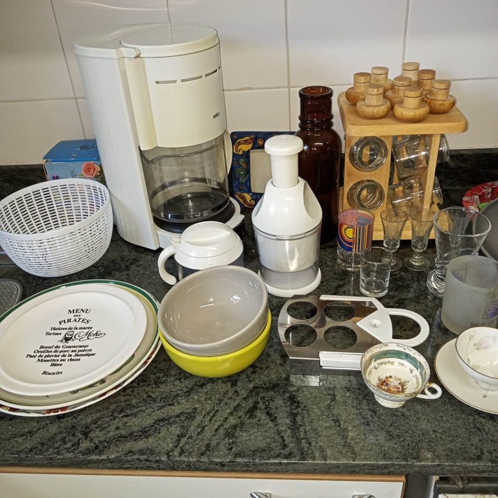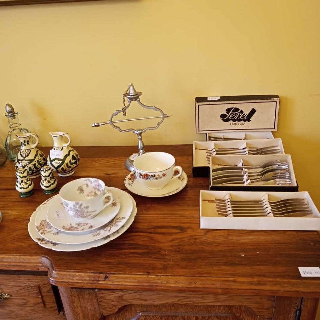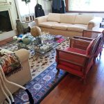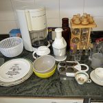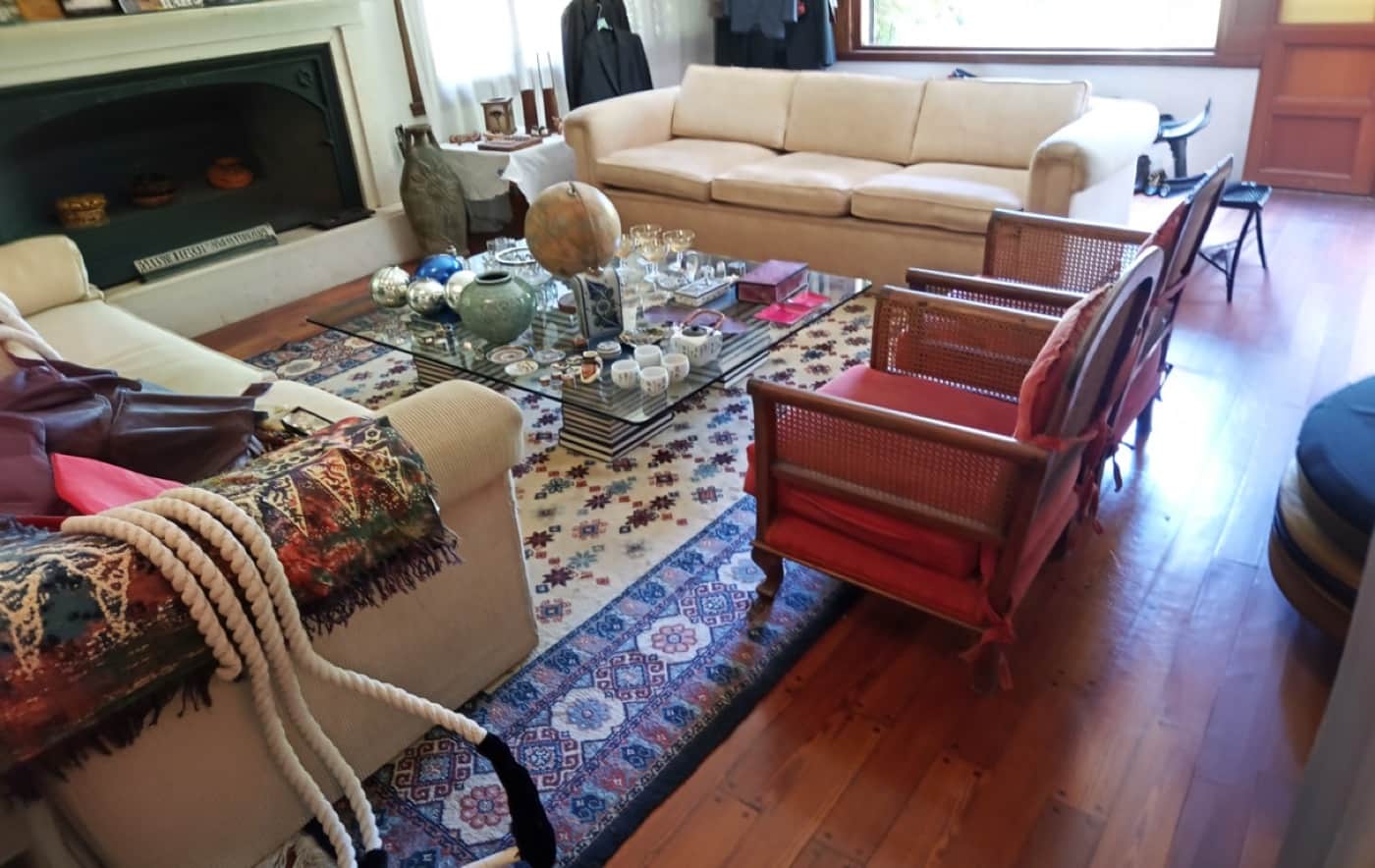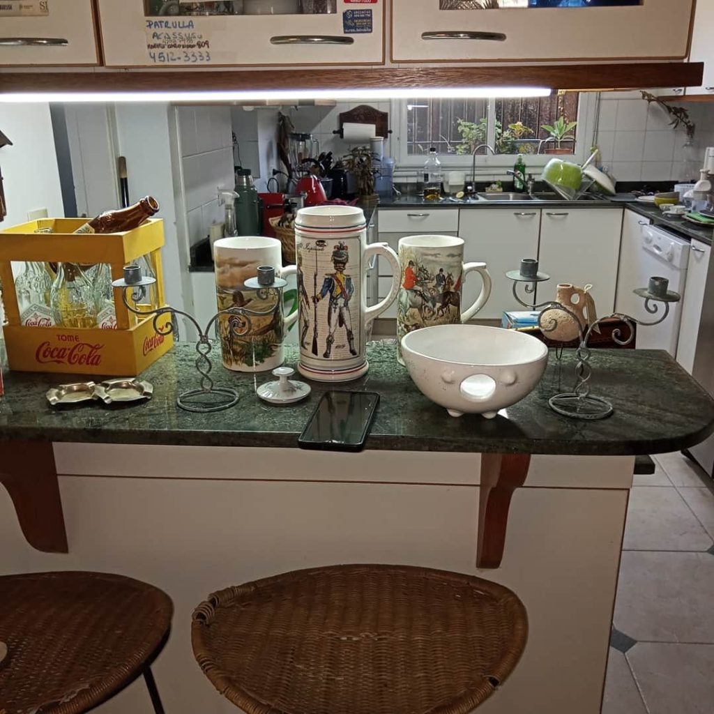 Sofá 3 cuerpos; par silloncitos esterillados con almohadones; mesas auxiliares varias; comedor roble estilo Chippendale: mesa con alargue y 6 sillas asiento tapizado; mueble bajo vajillero roble lavado 4 puertas y 3 cajones; banco 2 cuerpos con tapa asiento; mesa porta TV gris; cama hierro 2 plazas; colchón 2 plazas; par mesas luz rattan-Adornos, vajilla; juegos te y café; chopps; antigua licorera en carruaje; floreros azules; metal plateado, jarras, bandejas; bandejas peltrina; cubiertos pescado Perel; globo terráqueo; juegos de mesa madera; jarrones cerámica; cajas varios tamaños; miniaturas; campana bronce; plancha antigua; cuadro firmado Oliva, óleo; láminas gauchescas firmadas Osvaldo Gasparini; portarretratos; araña bronce estilo Holandés; lámpara de mesa cerámica blanca; apliques con tulipas antiguas-Heladera doble puerta acero, 110w; secarropas GE a 110w; microondas Samsung 110w; soda PSA; enseres cocina, especiero, fuentes; estufa Bram metal; juego jardín fundición de aluminio; accesorios bebé: coche jogger 3 ruedas, sillita auto, sillita para colgar en mesas; rollers; trapecio de circo aéreo nuevo; raquetas, paletas; libros-Ropa hombre, mujer, accesorios; bijoux y más…