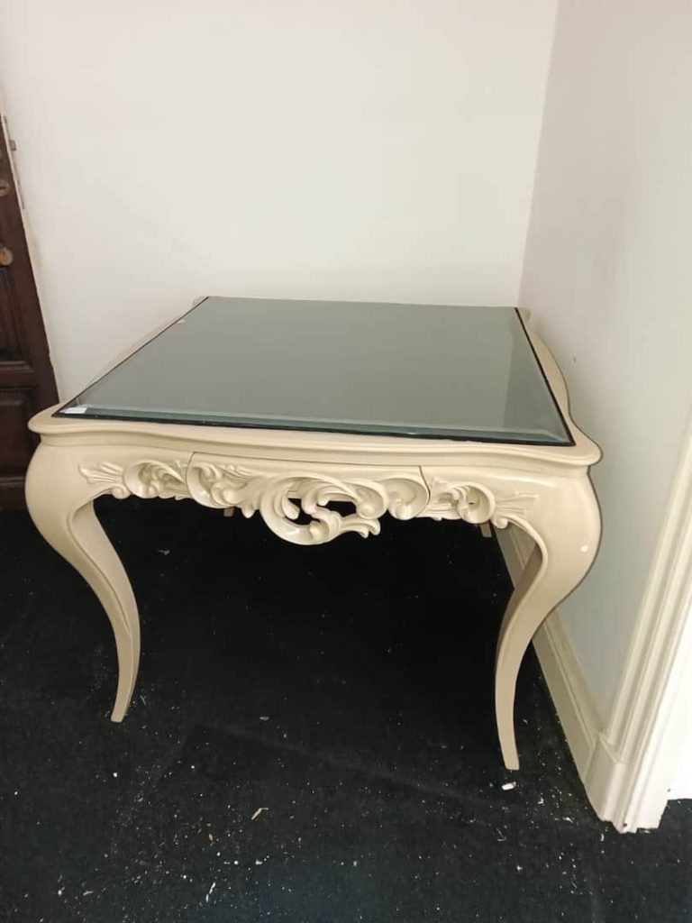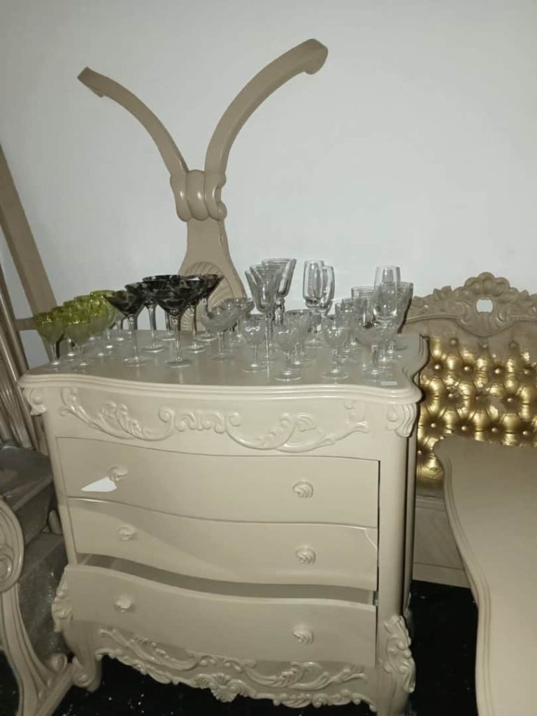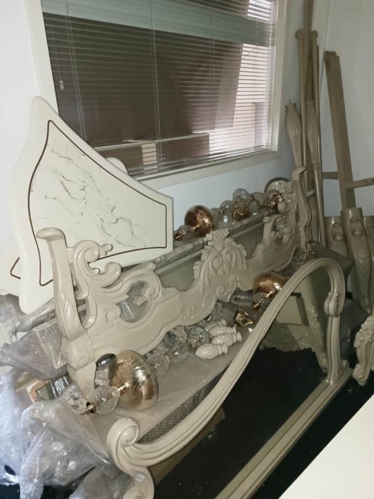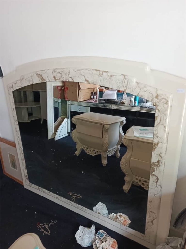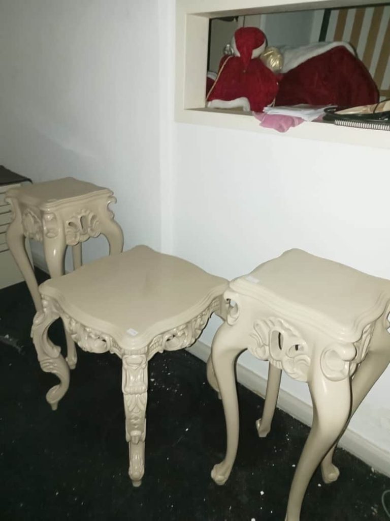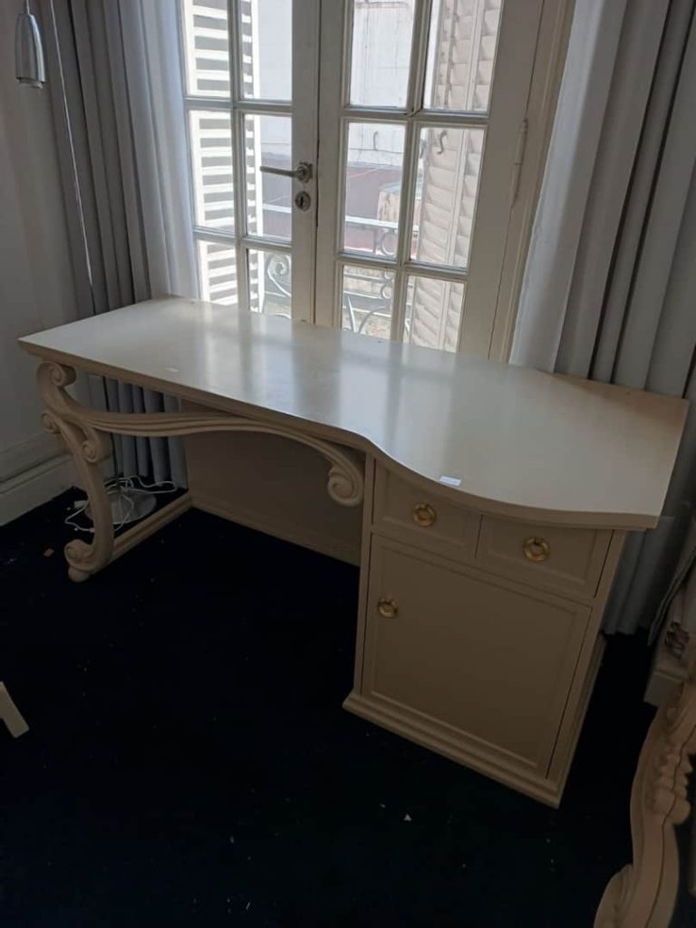 Silloncitos asiento tapizado en azul; 4 banquetas blancas; mesas auxiliares: laqueada tapa cuadrada y 4 cajones, doble pedestal laqueada tapa símil mármol, tapa rectangular estilo Francés, de diseño estructura platil, otras; consola espejada; escritorio laqueado 1 cajón, 1 puerta; respaldo en cuero y tachas; cantidad cómodas laqueadas, patinada de blanco, en azulino y otras; respaldo de cama capitoné; par mesas de luz estilo Francés 2 cajones, otras espejadas, laqueadas-Adornos y vajilla; 10 platos color; 2 masiteros con pie personajes; figura porcelana “Mujer leyendo” base en bronce; cristalería, copas y vasos, 6 copas champagne tornasoladas, servilletero y despojador “Cisnes”; par pedestales; espejos varios, marcos laqueados, marco laqueado en madera tallada 1.17 x 80 cm, rectangular biselado con marco en madera patinada 1.57 x 85 cm, patinado tallado 1.30 x 80 cm; cuadro decorativo “Dubai” marco laqueado; láminas enmarcadas; artefactos lumínicos y lote de caireles; par lámparas en vidrio, platil y más…