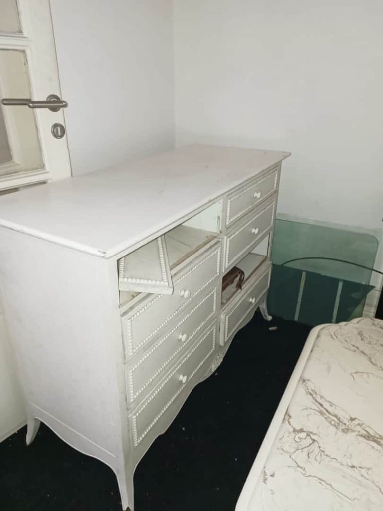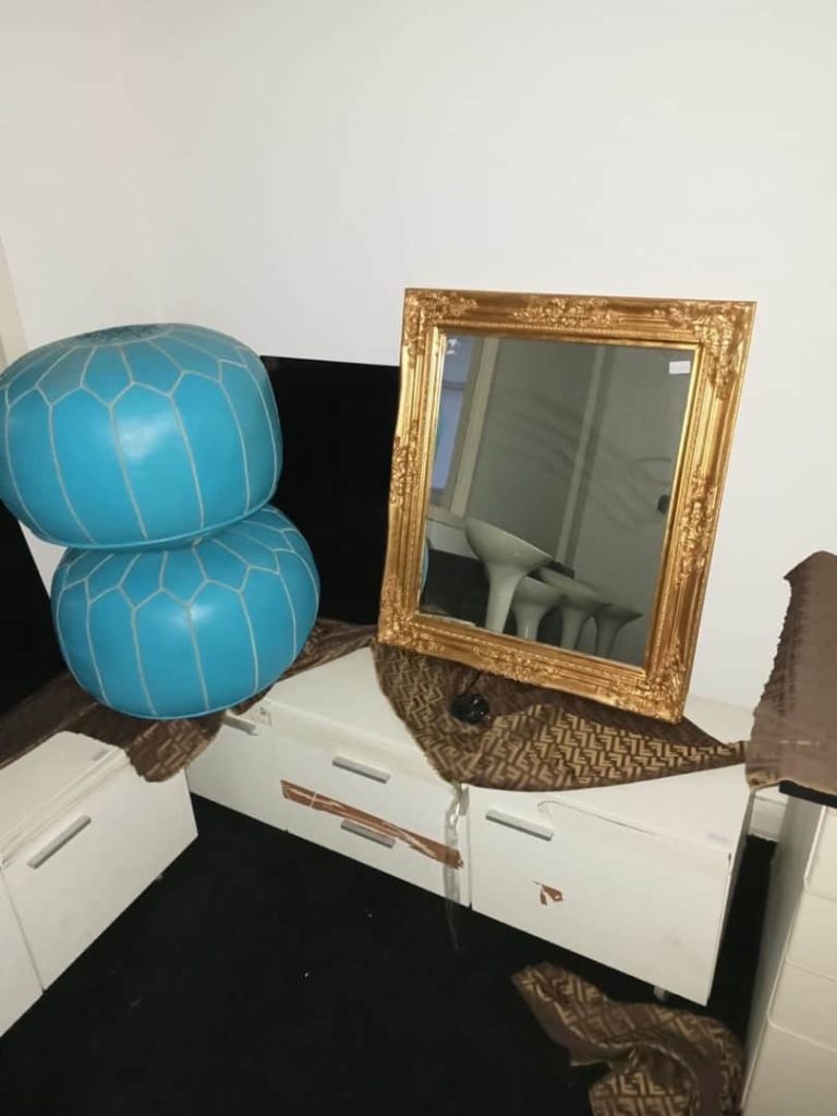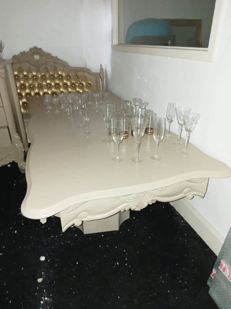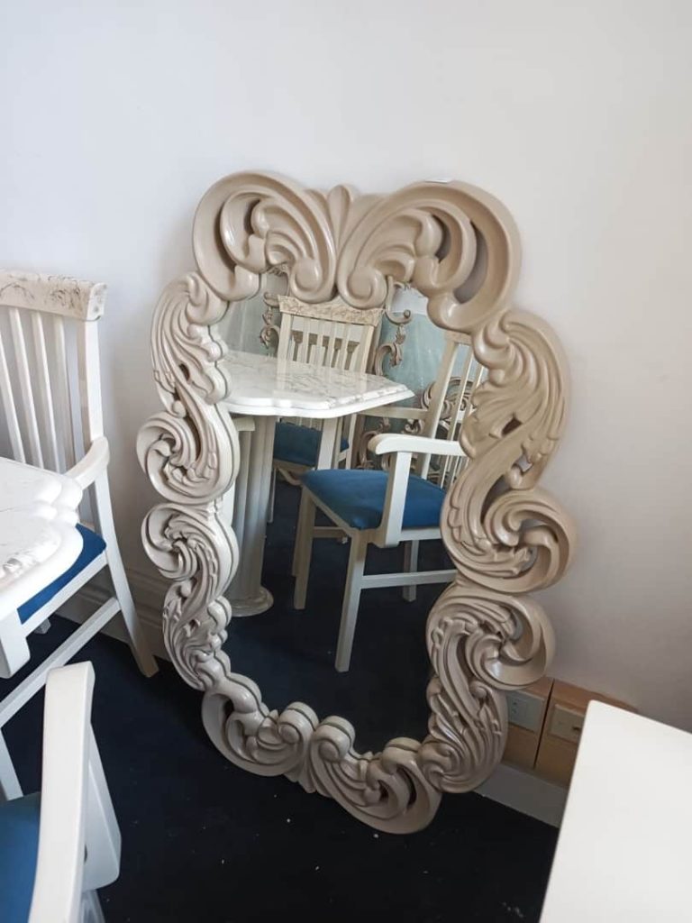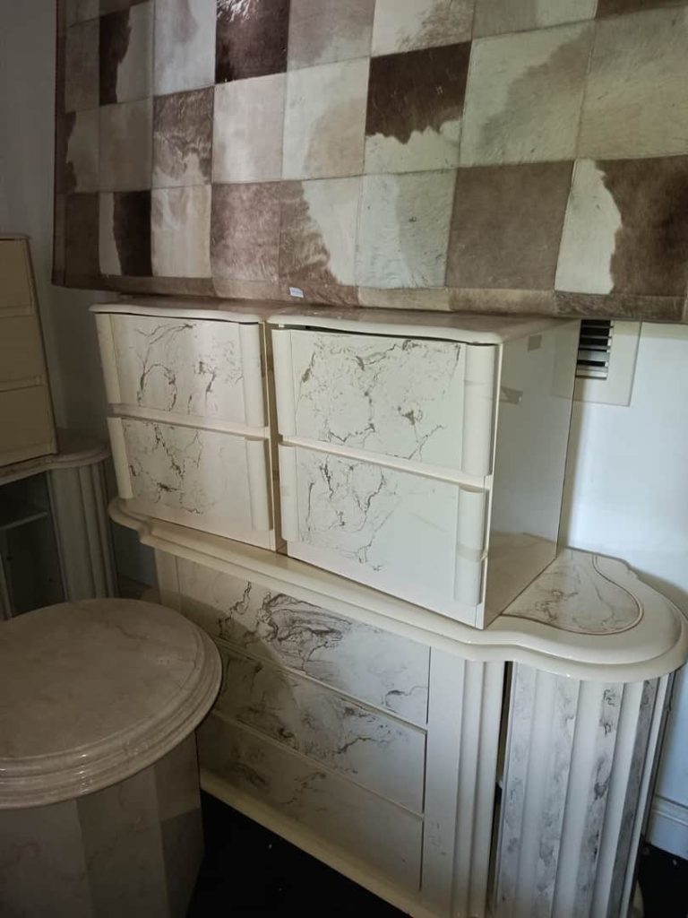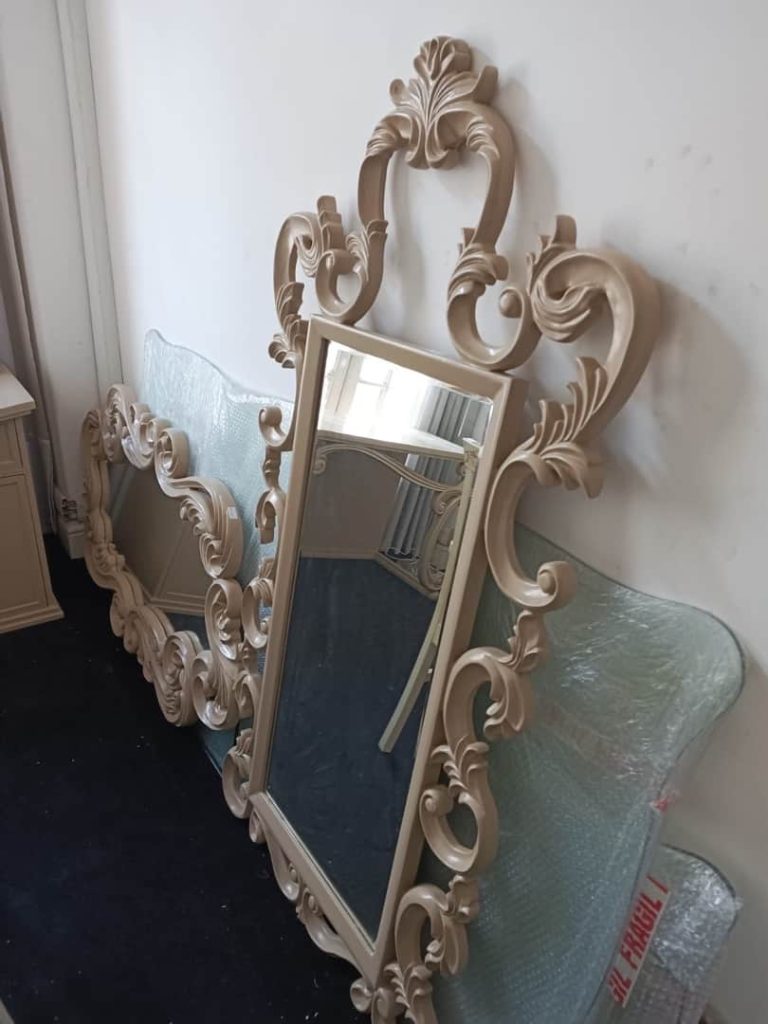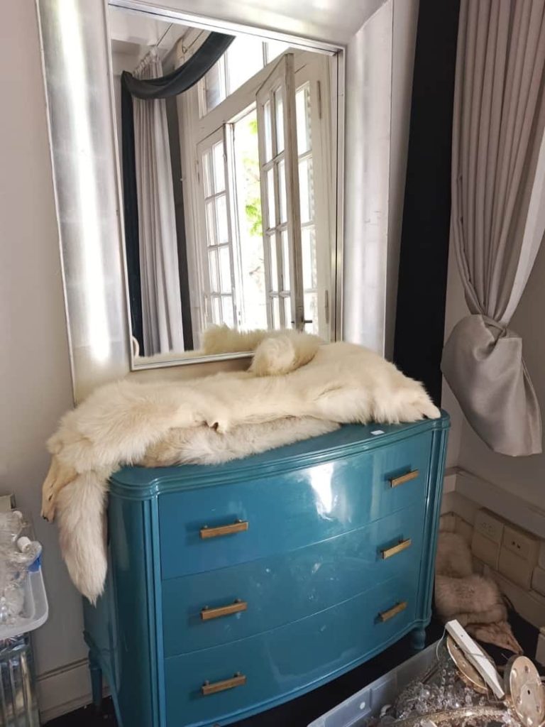 Silloncitos asiento tapizado en azul; 4 banquetas blancas; mesas auxiliares: laqueada tapa cuadrada y 4 cajones, doble pedestal laqueada tapa símil mármol, tapa rectangular estilo Francés, de diseño estructura platil, otras; consola espejada; escritorio laqueado 1 cajón, 1 puerta; respaldo en cuero y tachas; cantidad cómodas laqueadas, patinada de blanco, en azulino y otras; respaldo de cama capitoné; par mesas de luz estilo Francés 2 cajones, otras espejadas, laqueadas-Adornos y vajilla; 10 platos color; 2 masiteros con pie personajes; figura porcelana “Mujer leyendo” base en bronce; cristalería, copas y vasos, 6 copas champagne tornasoladas, servilletero y despojador “Cisnes”; par pedestales; espejos varios, marcos laqueados, marco laqueado en madera tallada 1.17 x 80 cm, rectangular biselado con marco en madera patinada 1.57 x 85 cm, patinado tallado 1.30 x 80 cm; cuadro decorativo “Dubai” marco laqueado; láminas enmarcadas; artefactos lumínicos y lote de caireles; par lámparas en vidrio, platil y más…