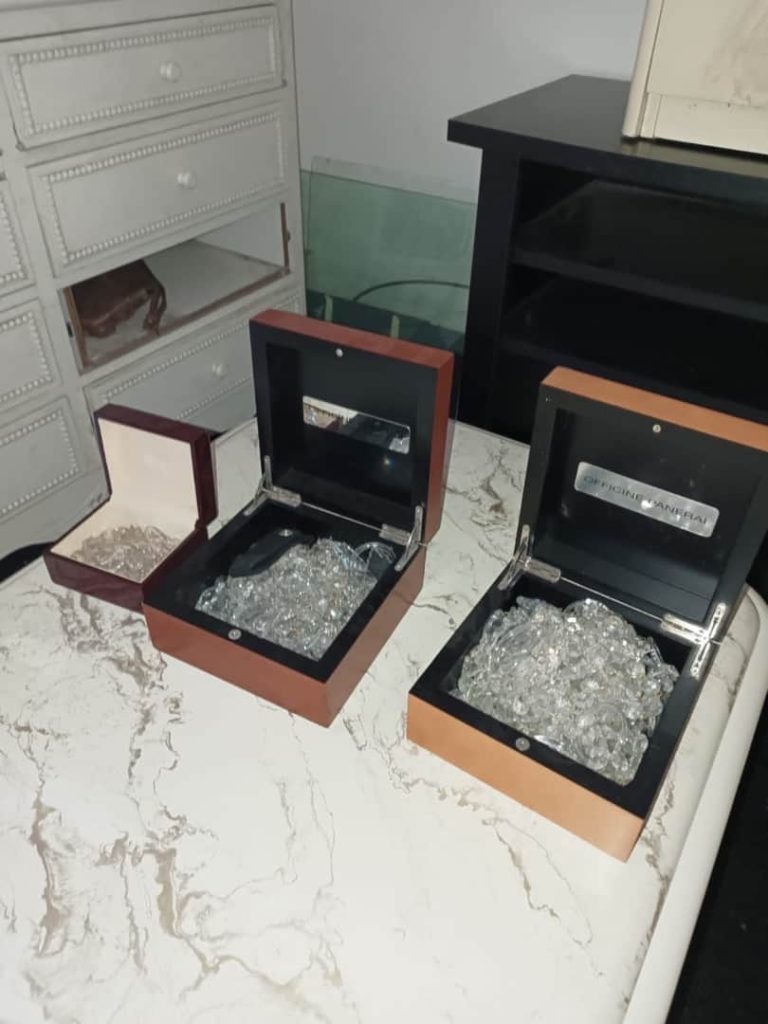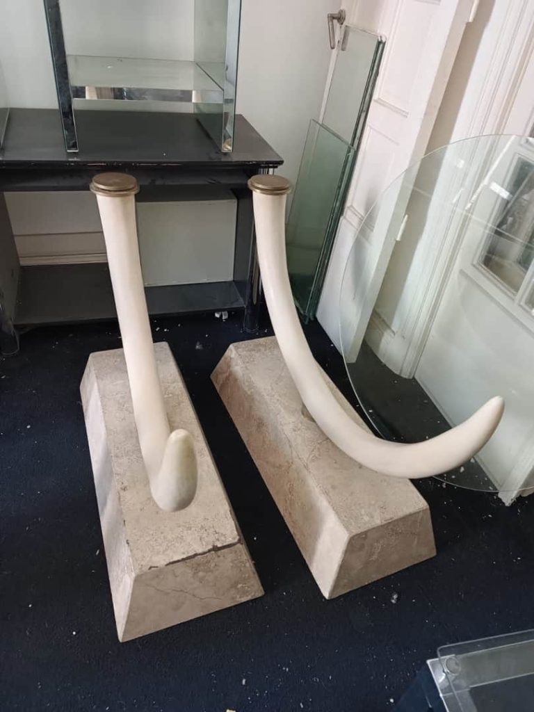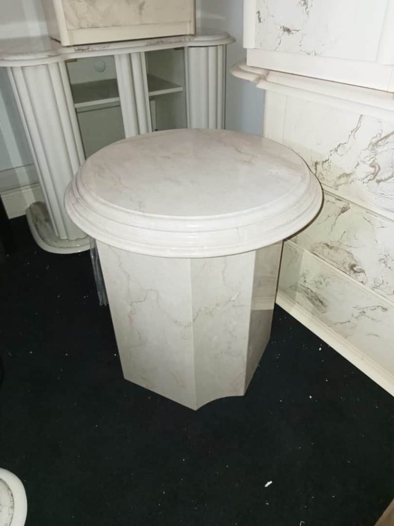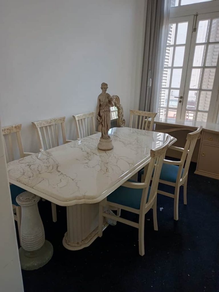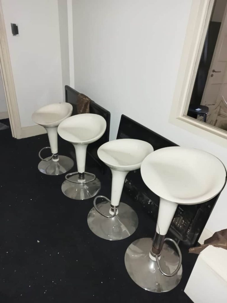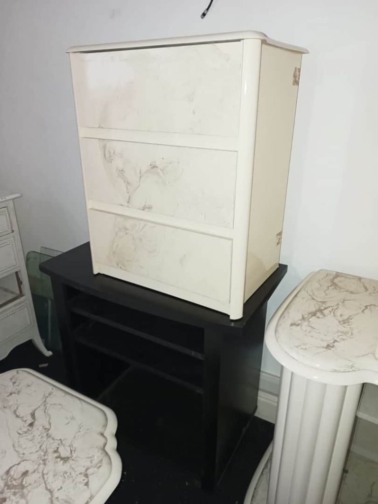 Silloncitos asiento tapizado en azul; 4 banquetas blancas; mesas auxiliares: laqueada tapa cuadrada y 4 cajones, doble pedestal laqueada tapa símil mármol, tapa rectangular estilo Francés, de diseño estructura platil, otras; consola espejada; escritorio laqueado 1 cajón, 1 puerta; respaldo en cuero y tachas; cantidad cómodas laqueadas, patinada de blanco, en azulino y otras; respaldo de cama capitoné; par mesas de luz estilo Francés 2 cajones, otras espejadas, laqueadas-Adornos y vajilla; 10 platos color; 2 masiteros con pie personajes; figura porcelana “Mujer leyendo” base en bronce; cristalería, copas y vasos, 6 copas champagne tornasoladas, servilletero y despojador “Cisnes”; par pedestales; espejos varios, marcos laqueados, marco laqueado en madera tallada 1.17 x 80 cm, rectangular biselado con marco en madera patinada 1.57 x 85 cm, patinado tallado 1.30 x 80 cm; cuadro decorativo “Dubai” marco laqueado; láminas enmarcadas; artefactos lumínicos y lote de caireles; par lámparas en vidrio, platil y más…